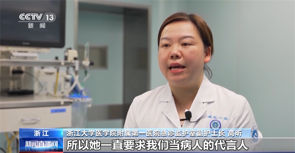 浙江大学医学院附属第一医院急诊监护室副护士长 高昕:她有一个非常敏感的洞察护理问题能力,她非常注重管道的积水问题,哪怕是有一滴水呛到病人的肺里面,可能就是一个不可逆的肺部感染影响。所以她一直要求我们当病人的代言人,从病人身上及早发现一些问题。