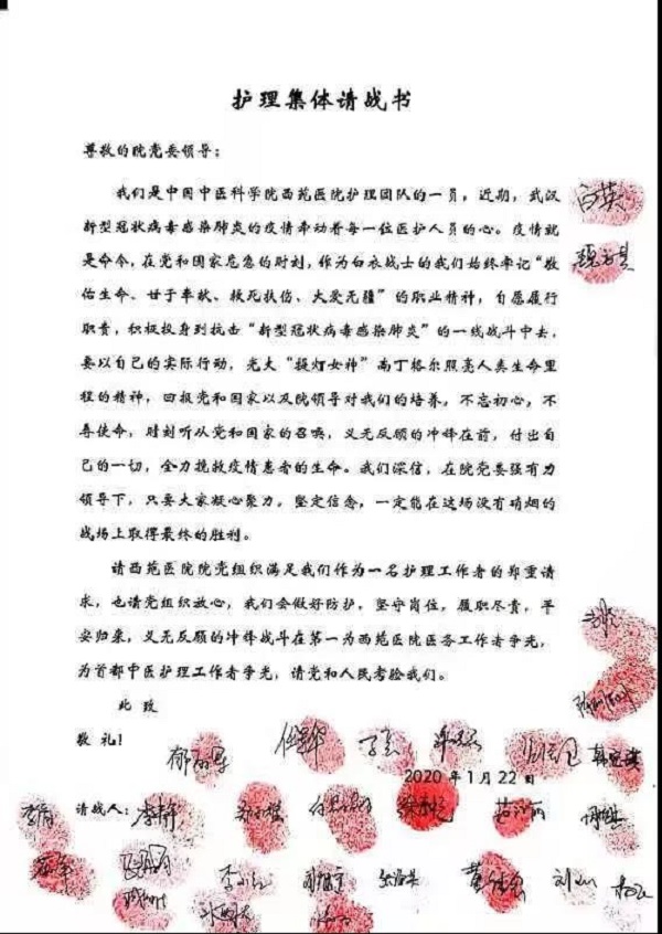 在疫情发现之初,西苑医院专家和护理人员纷纷表示,疫情就是命令,作为白衣战士要始终牢记“敬佑生命、甘于奉献、救死扶伤、大爱无疆”的职业精神,自愿履行职责,积极投身到抗击新型冠状病毒感染的肺炎的一线战斗中去。急诊科党支部书记杨志旭在请战书中表示,“2003年我曾作为专家组成员去过长辛店定点医院抗击非典,这些年我也一直在进行中西医结合治疗感染性疾病的研究,尤其使用中医药治疗病毒感染性疾病,有很多心得体会。我庄严申请,若国家有需要,我将时刻准备进入抗击新型肺炎的临床第一线工作,昨晚,我已经和家人商量过了,她们一致支持我上前线。”