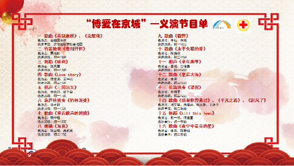 参加义演的同学准备用自己的才艺表演来奉献自己的爱心。当音乐响起,合唱团同学唱起了激情澎湃的开场曲,接下来就是多才多艺的同学们大显身手的时刻了。优美动听的竹笛独奏、阮和吉他的合奏、俏皮的相声、高雅的歌剧、感情丰富的诗朗诵、柔美的舞蹈……随着BLACKPINK《kill this love》的歌声响起,初一年级杨一帆、何佳蔓随歌起舞,将演出推入高潮。台下的同学们一起大合唱,欢呼尖叫,甚至有的同学跟随着音乐一起舞动起来……